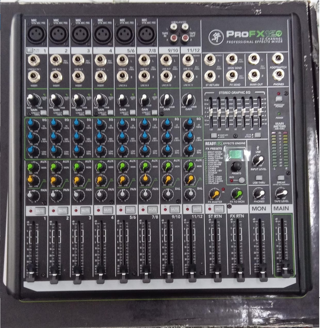 Além das entradas de microfone, o ProFX12v2 inclui 12 entradas de linha de teclados de ligação, samplers, e outros equipamentos. Há também uma entrada de fita RCA e saída para ligação de leitores de música portáteis dispositivos semelhantes. Além disso, o misturador tem robusto 60mm faders para todos os canais de entrada, retorno e principais mestres / monitor.